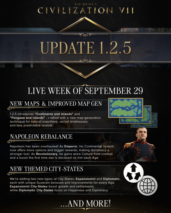 Sara came gain by today, to tell us that the next update, 1.2.5, will be coming soon! It seems we will be getting 2 new map scripts, Napoleon will get rebalanced and new city states will be included. Part 2 of the Right to Rule DLC will also be released, with Lakshmibai, Silla, and Qajar.